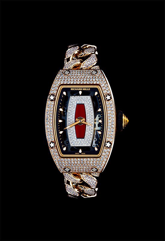 若说 RM 07-01 凭借机械工艺的极致完美而光彩亮丽,那么酒桶形表壳设计所展现的流畅婀娜线条,以及 中心镶嵌宝石的表盘则更让人过目不忘。水滴形的时间刻度与机芯的线条遥相辉映,充分诠释了 Richard Mille在21世纪的制表之道。