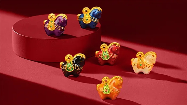 在设计与文化层面,周大生唐马系列以“文化赋能设计,场景适配需求”为产品思路,突破传统生肖珠宝的具象化桎梏,创新性融合昭陵六骏的雄健风骨与敦煌流光的璀璨意境。设计上,既保留唐马圆润丰盈的经典形态,又通过马背铜钱元素、如意纹样以及四蹄上的吉祥柿蒂纹等巧思点缀,搭配宝石珐琅工艺的细腻呈现,让产品承载“力量与安康”的美好祝福;场景上,精准捕捉年轻消费者“悦己为核、场景为要” 的消费诉求,品牌推出六款色彩专属单品:砖红色「马上旺」适配马年祈福,墨黑色「马上赢」呼应竞技期许,奶茶色「马上富」贴合生活愿景,红橙色「马上成」契合学子备考,紫棠色「马上升」匹配职场进阶,靛蓝色「马上福」覆盖日常祈愿,全方位满足多元场景需求,让生肖珠宝既成为情感寄托的载体,又能融入日常佩戴场景。